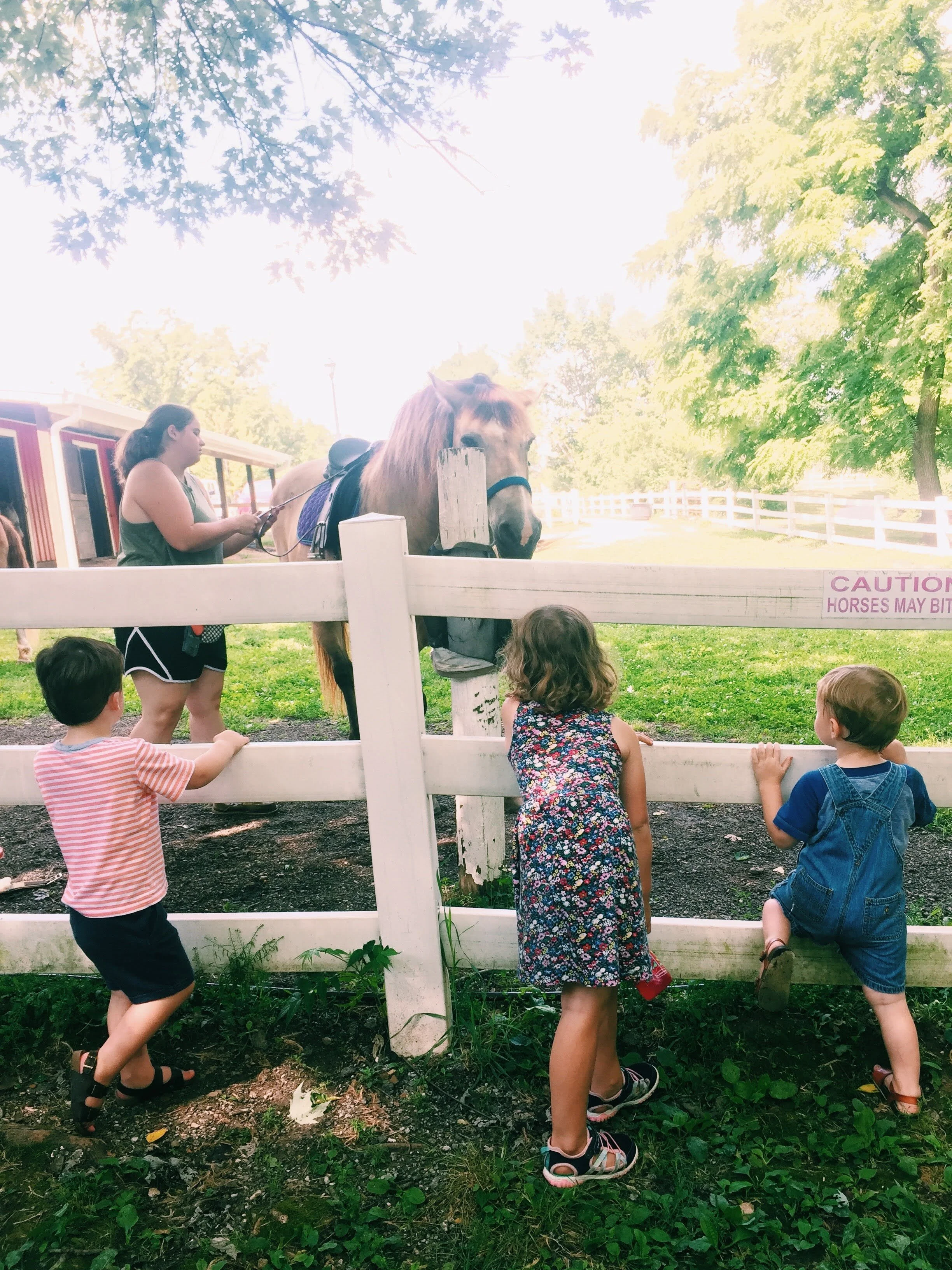 My friend Lauren and I went to Longview Farm Park in Town and Country one morning last week. This park has paved trails through a wooded area with a nice pond in the middle, but the real draw for our kids was the horses. We saw them in the pasture at the beginning of our walk and again near the barn as we finished. There was also a little fairy garden on a stump next to the barn and Oliver kept calling a white-haired gnome “Dad,” which made me both laugh and consider taking him to the eye doctor because my husband is 6’5 with very dark hair.